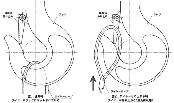 フック外れ止めにはいくつか種類がありますが、主に建築業で使われるクレーンフックには(図1)のような「ばね式外れ止め」が多く使われています。 知恵の輪現象とは? 玉掛け作業時に何らかの要因(無負荷状態になり)でワイヤーが浮かび上り(図2)、ワイヤーのヨレや回転、風などでワイヤーがフック先端を飛び越え(図3)、もう一度ワイヤーが降りてきたときにフックから外れてしまい(図4)、吊荷が落下してしまう現象です。 |